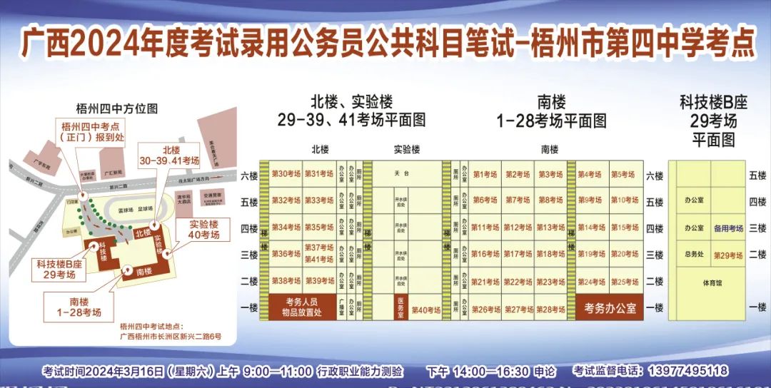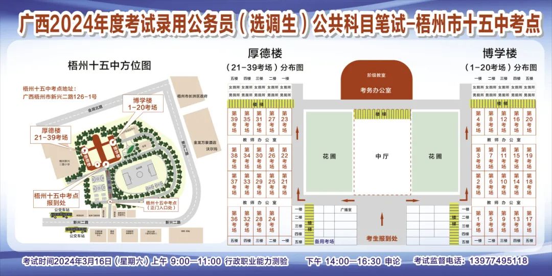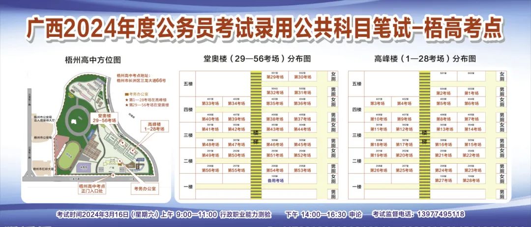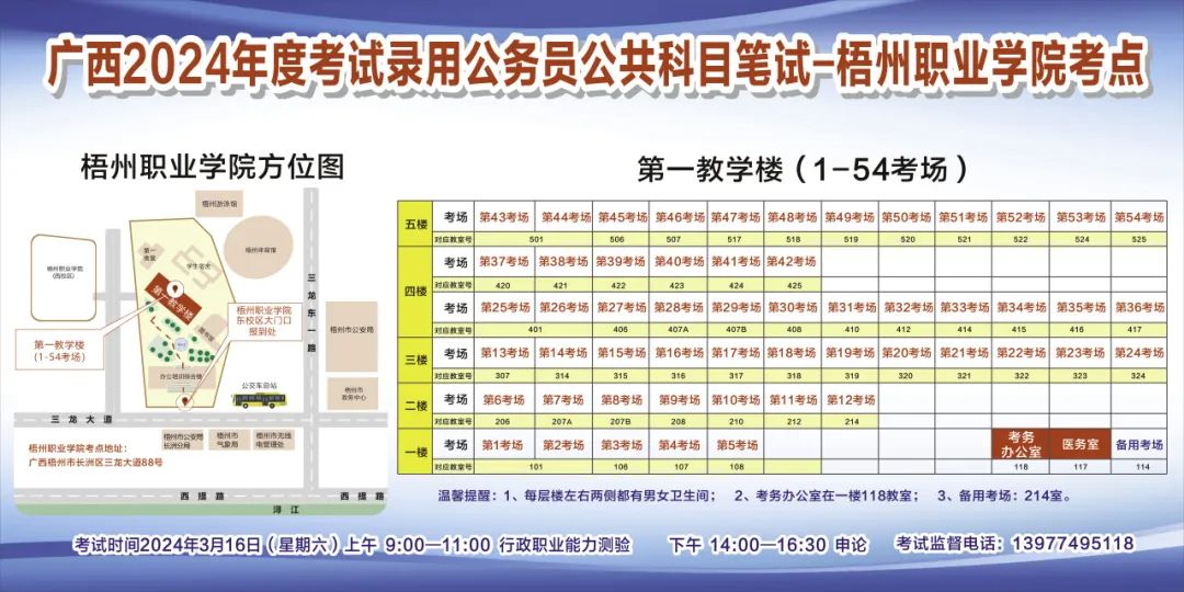 一、廣西2024年度考試錄用公務員(選調(diào)生)公共科目筆試將于3月16日舉行,梧州考區(qū)共設置9個考點,請考生提前熟悉各自考點位置、周邊環(huán)境及交通情況,考試當天提前出門做好準備,準時參加考試。特別提示:因考點停車場地有限,所有考生車輛不得進入考點,請考生規(guī)劃好前往考點的交通方式和路線。
