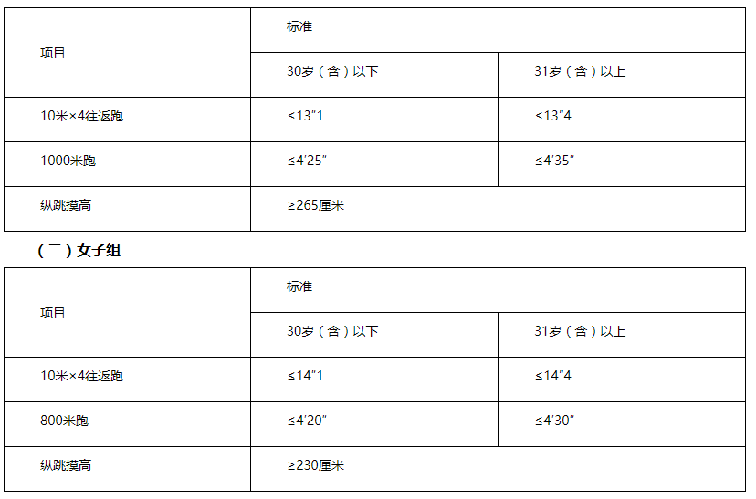 體能測評三項全部達(dá)標(biāo)方為合格。體能測評項目中,縱跳摸高的測試次數(shù)不超過3次,10米×4往返跑的測試次數(shù)不超過2次,長跑項目(男子1000米、女子800米)的測試次數(shù)為1次。