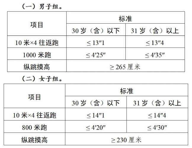 體能測評三項全部達標方為合格。報考緊缺職位的人員,體能測評三項中有二項達標的,視為合格。其中:縱跳摸高的測試次數(shù)不超過3次,10米×4往返跑的測試次數(shù)不超過2次,1000米跑/800米跑的測評次數(shù)為1次。