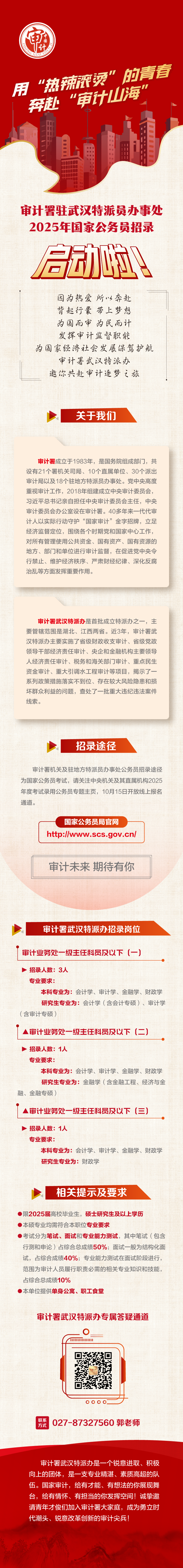 審計署駐武漢特派員辦事處2025年國家公務(wù)員招錄啟動!