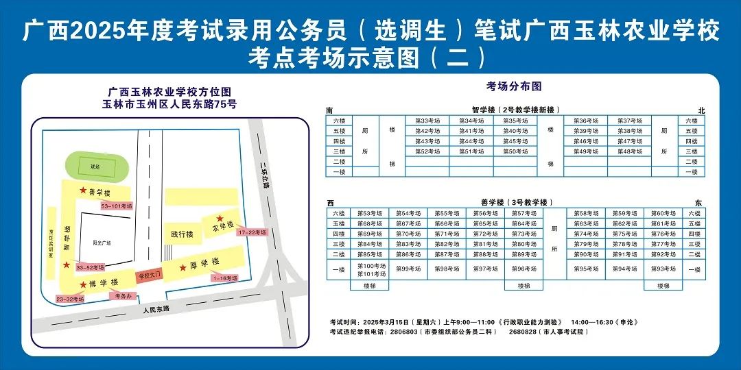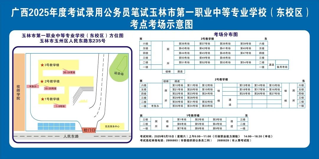 請(qǐng)?zhí)崆傲私獗救怂诳键c(diǎn)具體位置,熟悉考點(diǎn)周邊情況,特別是考點(diǎn)周邊的食宿、交通情況,合理做好食宿安排和出行計(jì)劃。需要特別注意的是:玉林市第一職業(yè)中等專(zhuān)業(yè)學(xué)校考點(diǎn)是設(shè)在該校的東校區(qū)(人民東路東235號(hào));玉林市第一中學(xué)考點(diǎn)是設(shè)在該校的運(yùn)嶺路校區(qū)(二環(huán)北路1228號(hào))!