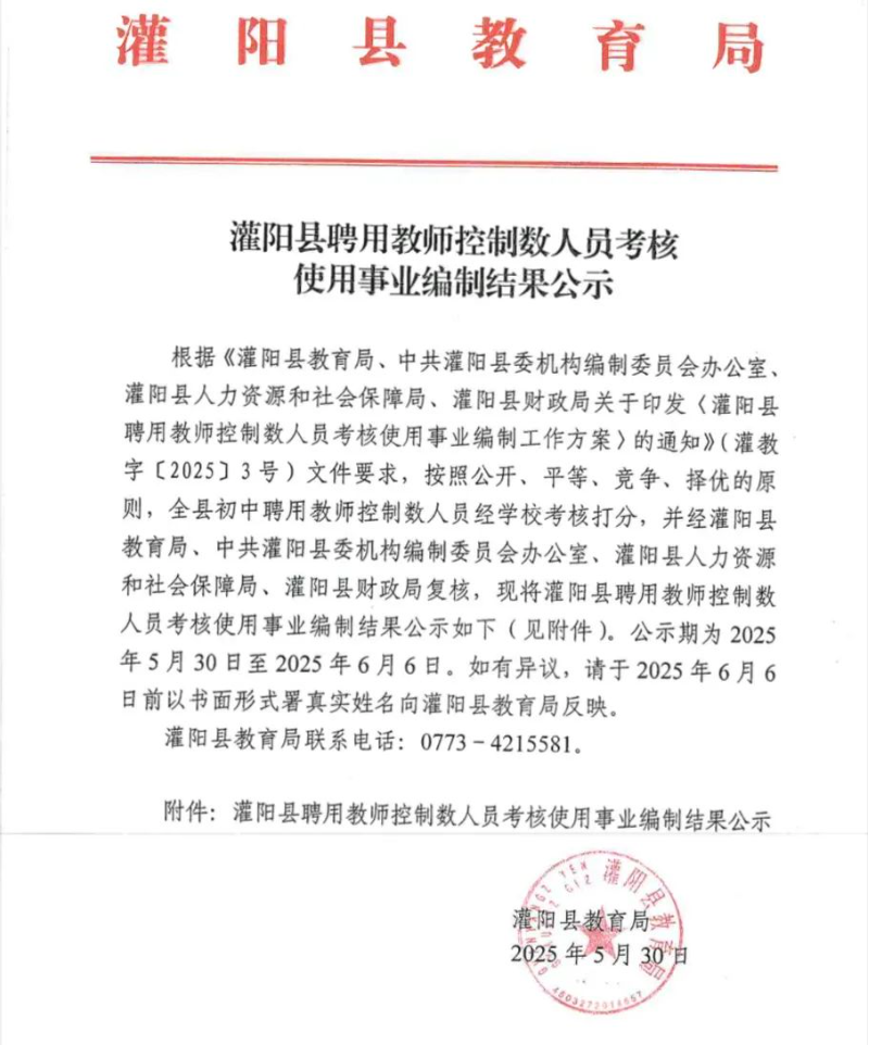 原文標題:灌陽縣聘用教師控制數(shù)人員考核使用事業(yè)編制結(jié)果公示