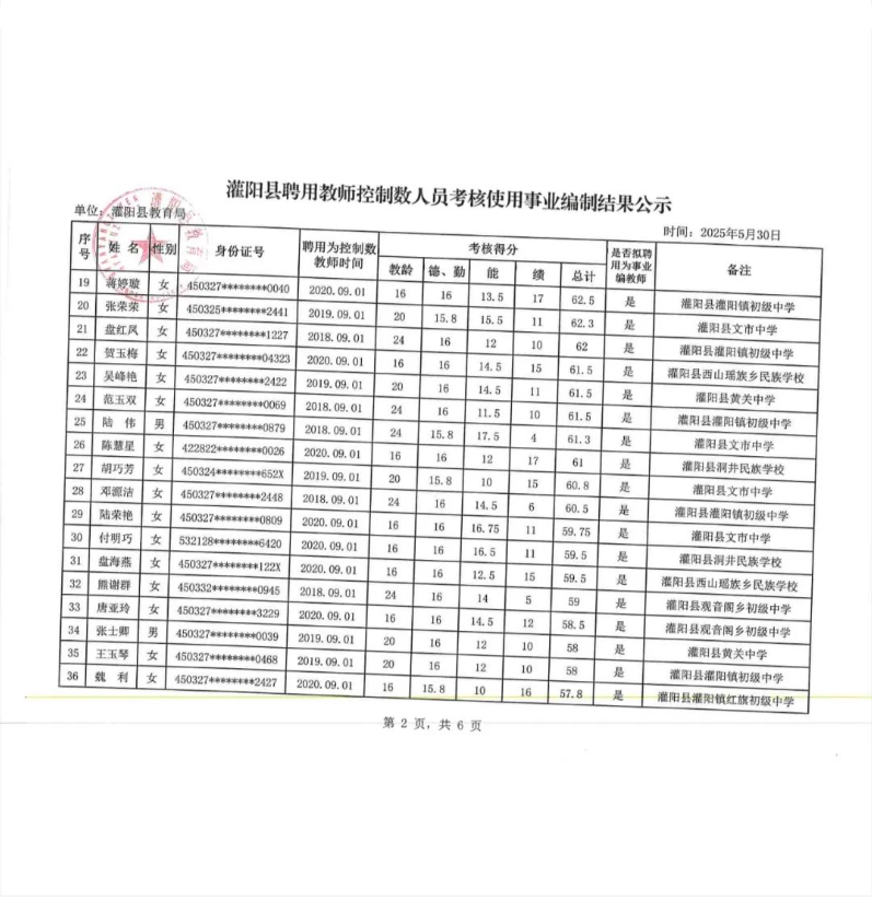 灌陽縣聘用教師控制數(shù)人員考核使用事業(yè)編制結(jié)果公示