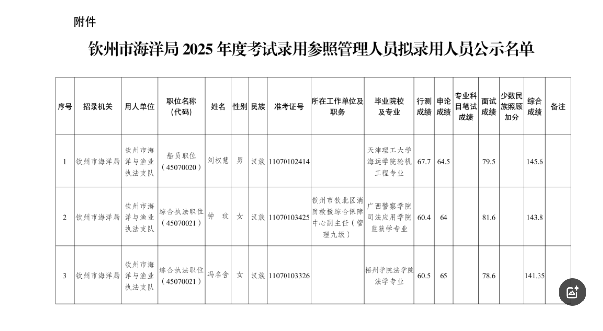 附件:欽州市海洋局2025年度考試錄用參照管理人員擬錄用人員公示名單