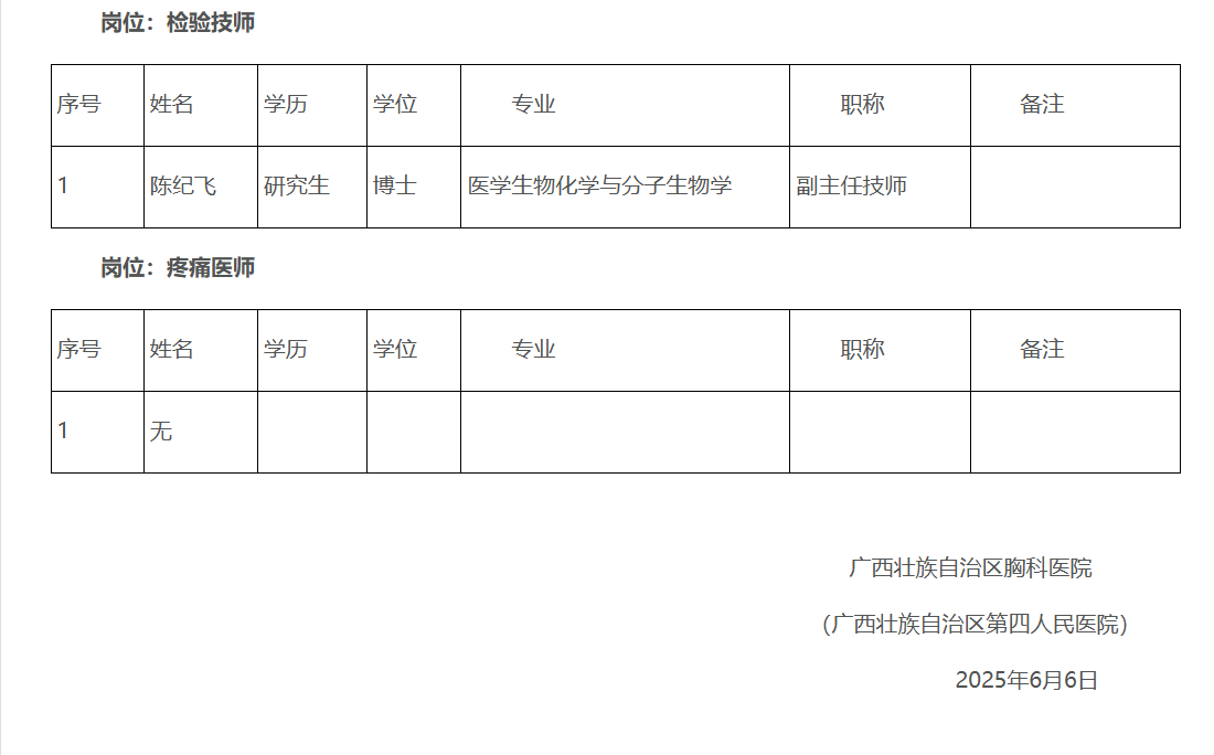 根據(jù)《自治區(qū)胸科醫(yī)院2025年度高層次人才公開招聘實(shí)名編制工作人員公告》要求,現(xiàn)將自治區(qū)胸科醫(yī)院2025年度高層次人才公開招聘實(shí)名編制工作人員報(bào)名通過資格審查人員名單公布如下: