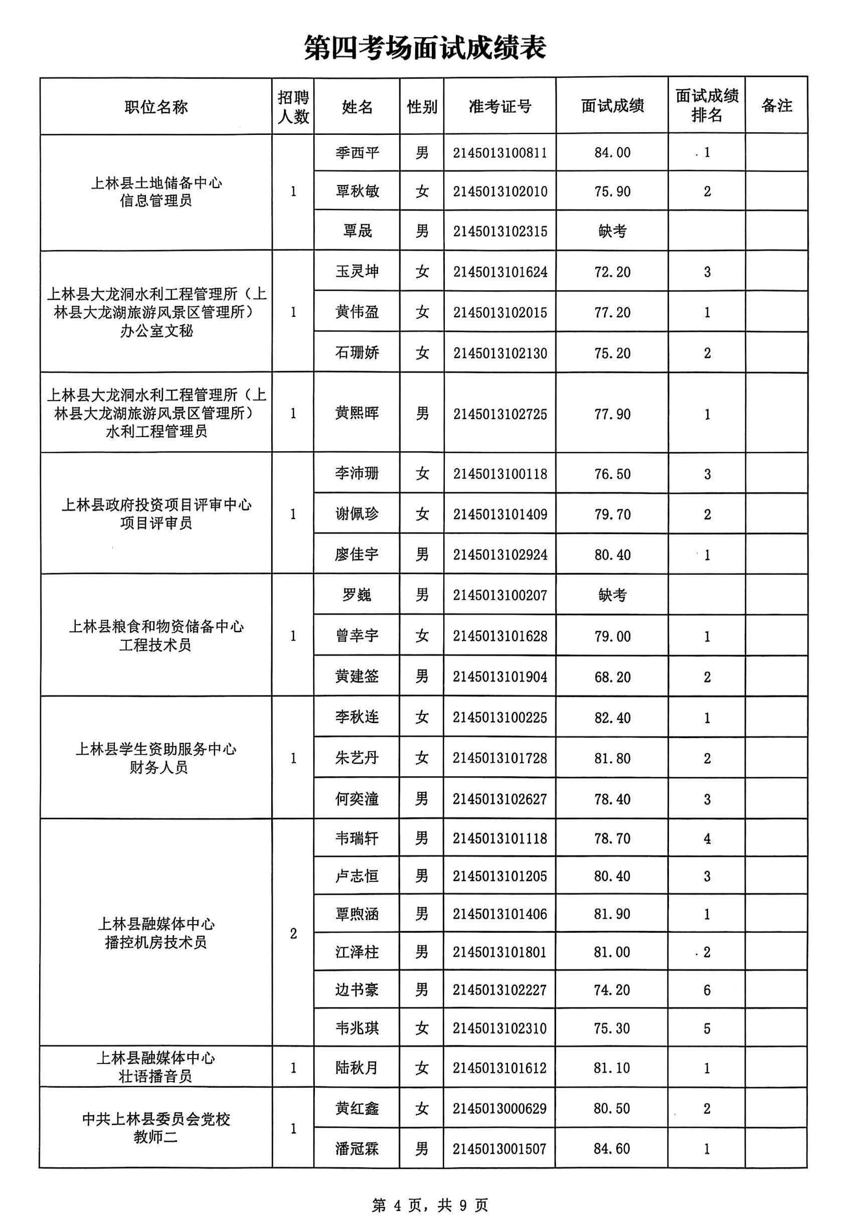 上林縣2025年公開考試招聘事業(yè)單位工作人員面試成績公布如下: