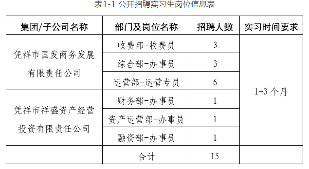 本次共計劃招聘憑祥市國際貿(mào)易開發(fā)集團(tuán)有限公司下屬企業(yè)實習(xí)生崗位15人。具體要求詳見《附件1:憑祥市國際貿(mào)易開發(fā)集團(tuán)有限公司2025年公開招聘暑期實習(xí)生崗位信息表》