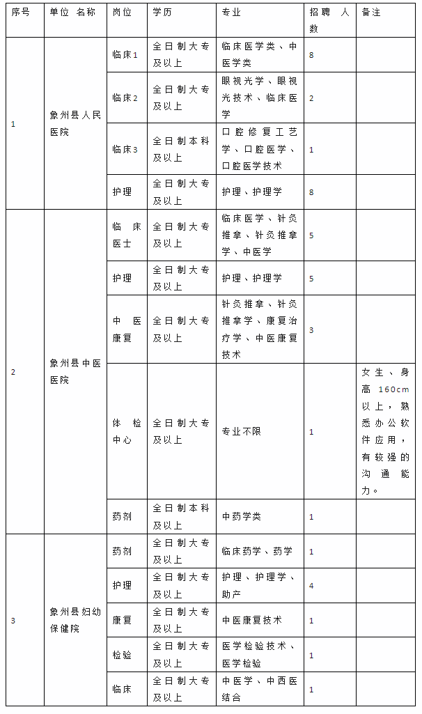 因工作需要,根據(jù)相關(guān)規(guī)定,我單位擬面向社會公開招聘見習(xí)人員42名,其中象州縣人民醫(yī)院19人、象州縣中醫(yī)醫(yī)院15人、象州縣婦幼保健院8人?,F(xiàn)將有關(guān)事項(xiàng)通知如下:
