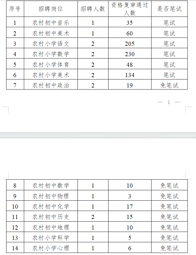 根據(jù)《桂林市雁山區(qū)2025年特崗教師招聘公告》要求“筆試按實際通過資格復(fù)審人數(shù)開考;招聘崗位資格復(fù)審?fù)ㄟ^人數(shù)不足20人免筆試,資格復(fù)審?fù)ㄟ^人數(shù)20人以上(含20人,研究生及以上學(xué)歷不包含在內(nèi),研究生及以上學(xué)歷免筆試),需進行筆試。”經(jīng)現(xiàn)場資格復(fù)審,桂林市雁山區(qū)2025年特崗教師招聘筆試、免筆試學(xué)科崗位情況如下: