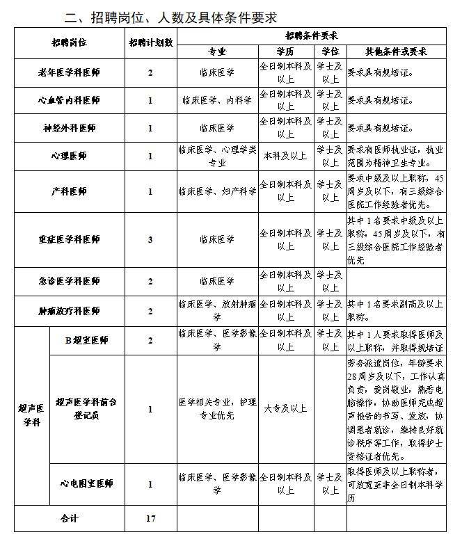 注:初中級職稱應聘人員原則上年齡要求為35周歲及以下;如為副高以上職稱,年齡可放寬至45周歲;學歷層次高者優(yōu)先。醫(yī)師崗位中如要求具有規(guī)培證條件的是指已取得規(guī)培合格證書(含通過規(guī)培結業(yè)考試未領合格證書)或已取得中級及以上職稱人員。