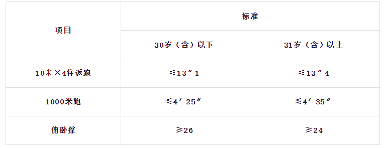 體能測試項目三項達標的,視為合格。10米×4往返跑項目的測評次數(shù)不超過2次,1000米跑、俯臥撐等項目的測評次數(shù)為1次。