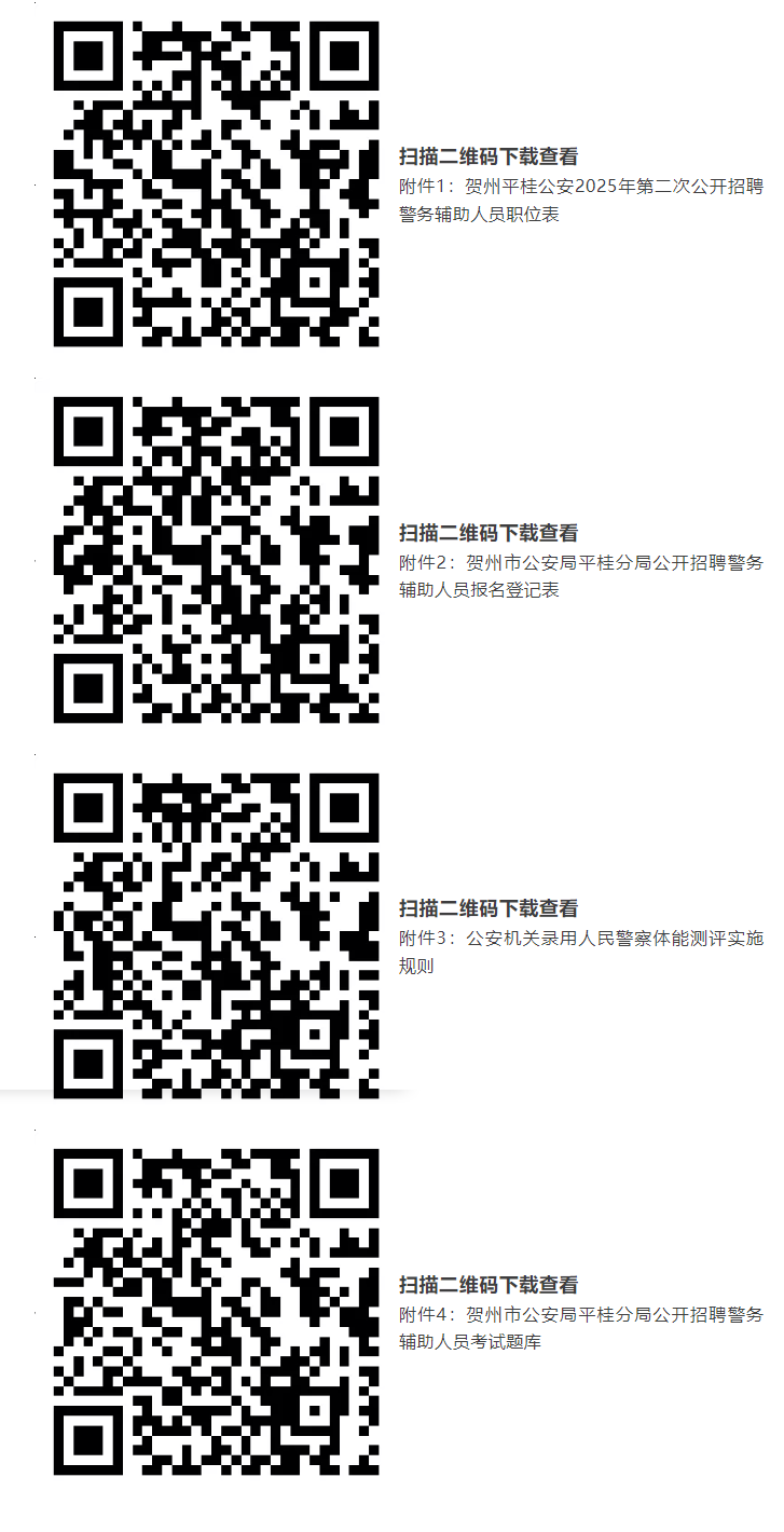 報(bào)考人員自2025年7月21日起,可通過賀州市公共就業(yè)和人才服務(wù)中心“賀州市微就業(yè)”官方微信(gxhzjy)、賀州市公安局平桂分局“平桂警方”官方微信(pggafj)查閱招聘簡(jiǎn)章及《職位計(jì)劃表》(附件1)等相關(guān)招聘信息。