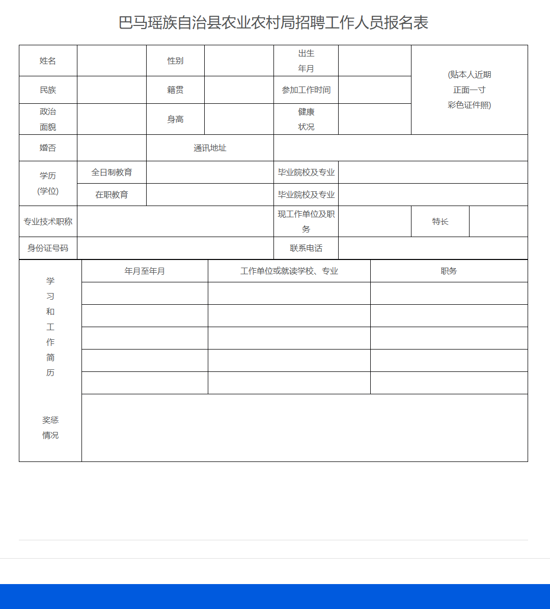 (1)《巴馬瑤族自治縣農業(yè)農村局招聘工作人員報名表》1份(詳見附件);