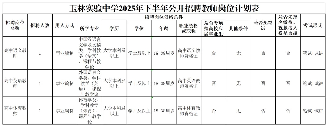 具體招聘信息請瀏覽玉林市人社局網(wǎng)站相關(guān)公告,以《玉林市2025年下半年公開招聘中小學(xué)幼兒園教師公告》為準(zhǔn)。