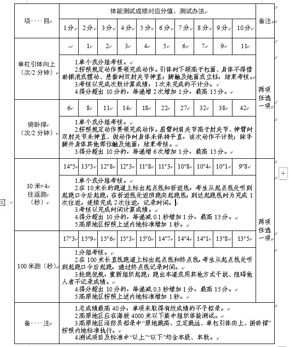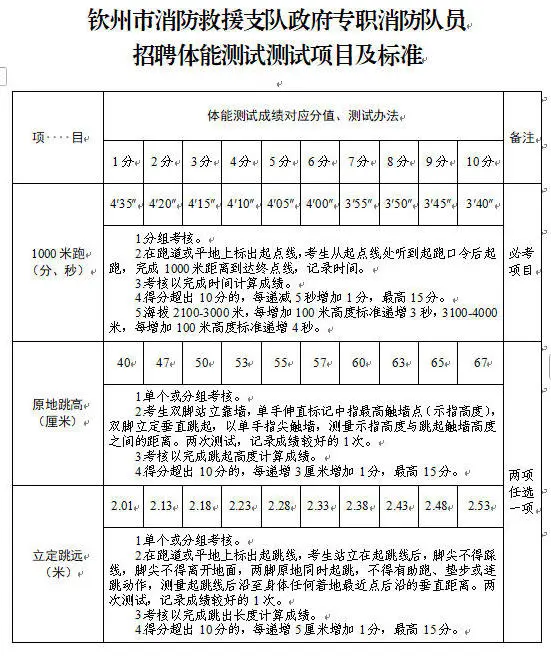 2.體能測(cè)試:(1)必考項(xiàng)目:1000米跑;(2)選考項(xiàng)目:①立定跳遠(yuǎn)、原地跳高二選一;②單杠引體向上、俯臥撐二選一;③10米×4往返跑、100米跑二選一;(3)注意事項(xiàng):體能測(cè)試有兩項(xiàng)及兩項(xiàng)以上不得分的視為不合格(標(biāo)準(zhǔn)參照附件)。未按時(shí)參加或因身體原因無(wú)法測(cè)試者,視為自動(dòng)放棄。