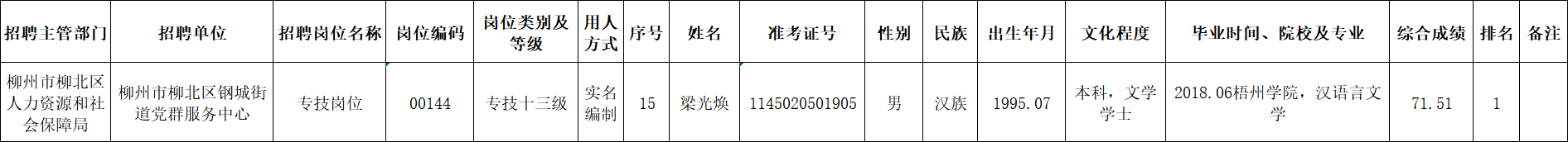 根據(jù)《柳州市2025年度下半年事業(yè)單位公開(kāi)考試招聘工作人員公告》要求及安排,梁光煥同志經(jīng)面試、考察、體檢合格,符合聘用條件。經(jīng)研究決定,擬聘用梁光煥同志為我區(qū)事業(yè)單位工作人員,現(xiàn)予以公示,公示期為5個(gè)工作日(2026年1月22日至2026年1月28日)。對(duì)擬聘用的同志如有異議,請(qǐng)以書(shū)面形式,并署真實(shí)姓名和聯(lián)系地址,于2026年1月28日前郵寄或直接送我單位(地址:柳州市勝利路12-8號(hào)柳北區(qū)政府4樓417室;郵編:545002,電話(huà)0772-2513360),群眾如實(shí)反映有關(guān)問(wèn)題受法律保護(hù)。