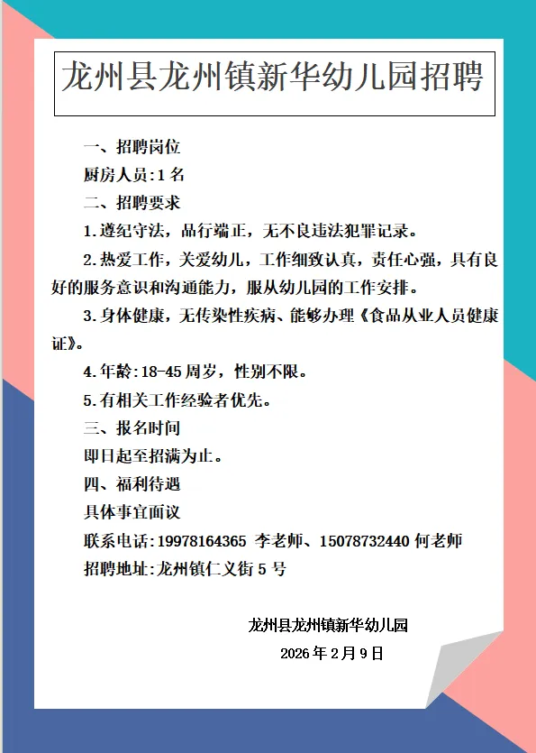 2026年崇左龍州縣龍州鎮(zhèn)新華幼兒園招1人