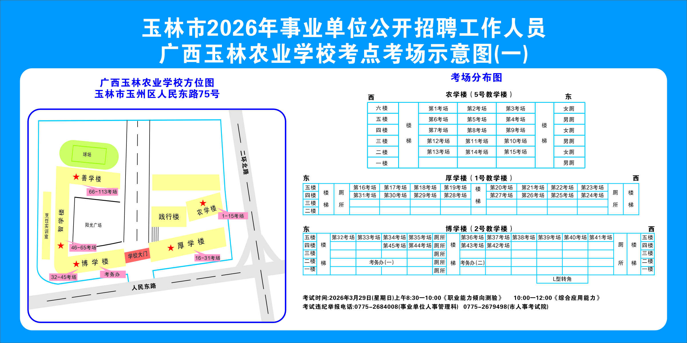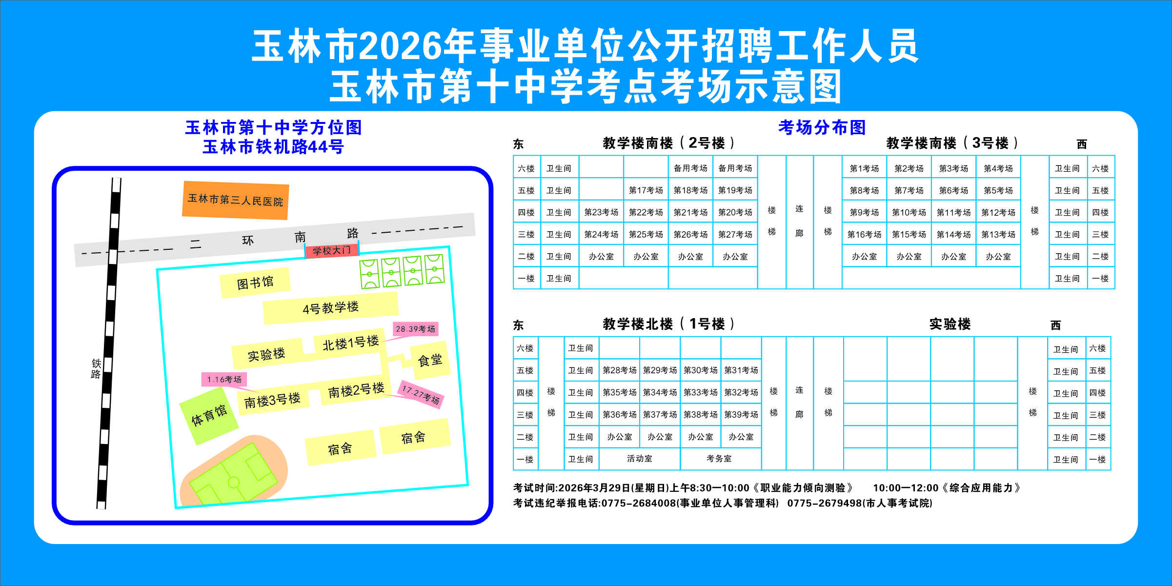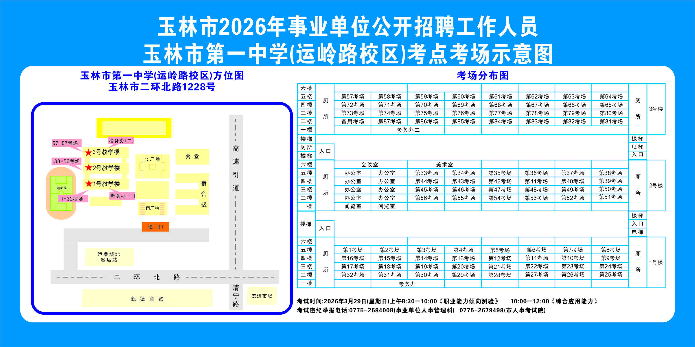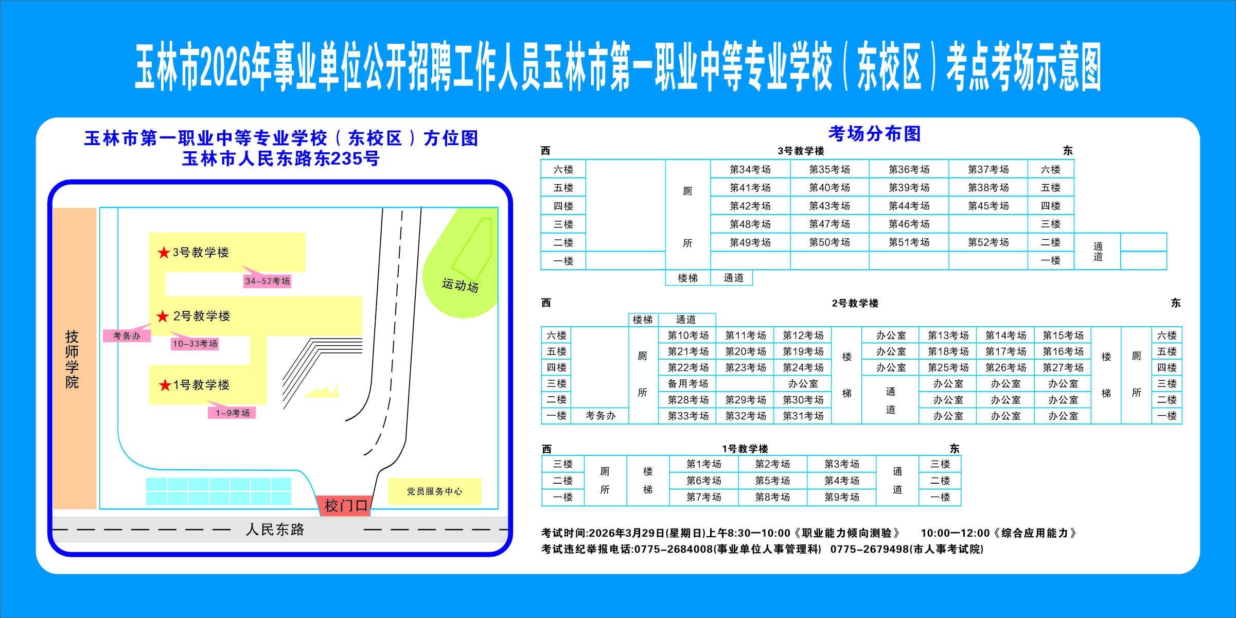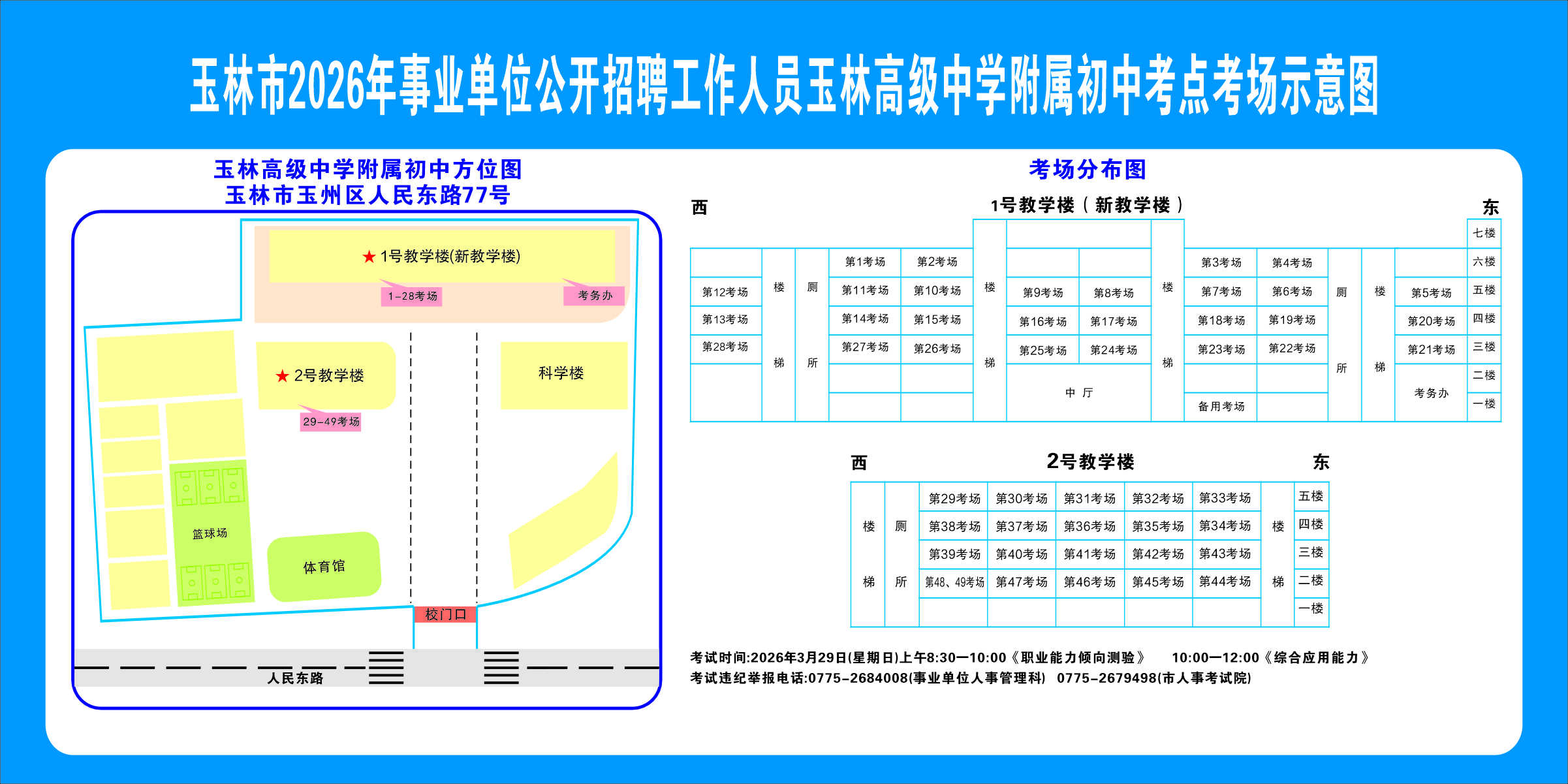 2.需要特別注意的是:玉林市第一職業(yè)中等專業(yè)學(xué)??键c(diǎn)是設(shè)在該校的東校區(qū)(人民東路東235號(hào));玉林市第一中學(xué)考點(diǎn)分為運(yùn)嶺路校區(qū)(二環(huán)北路1228號(hào))、大北路校區(qū)(大北路453號(hào))。