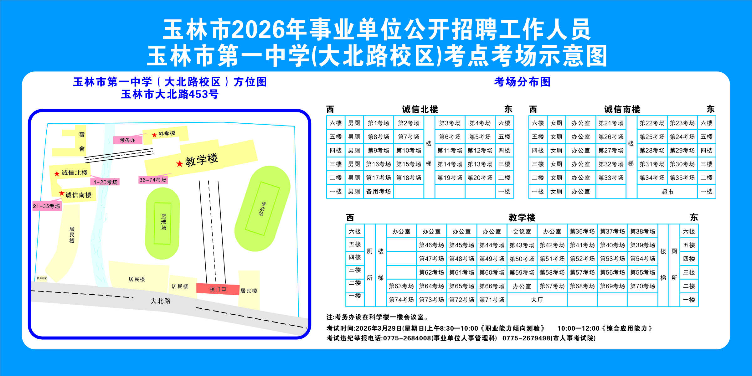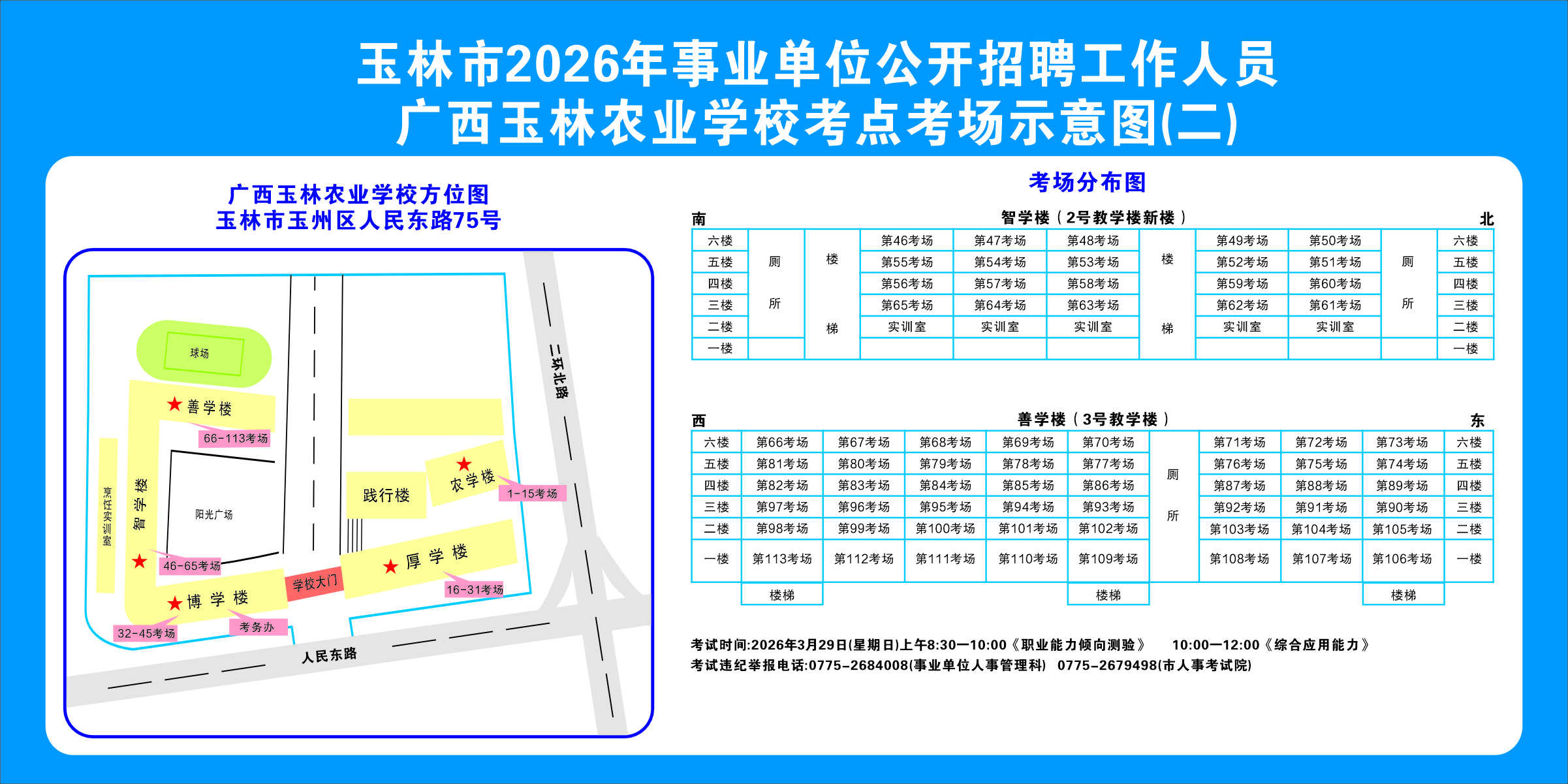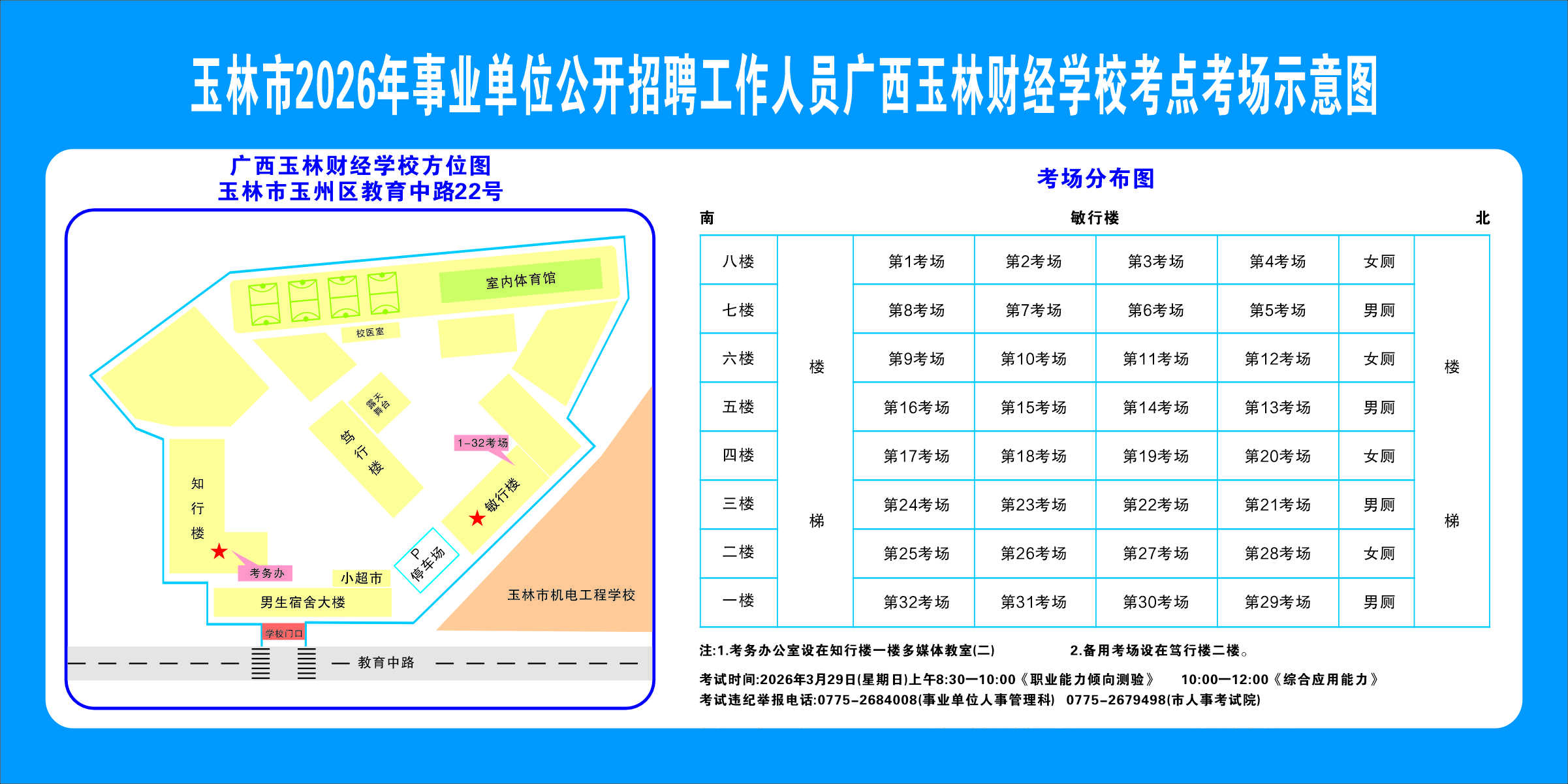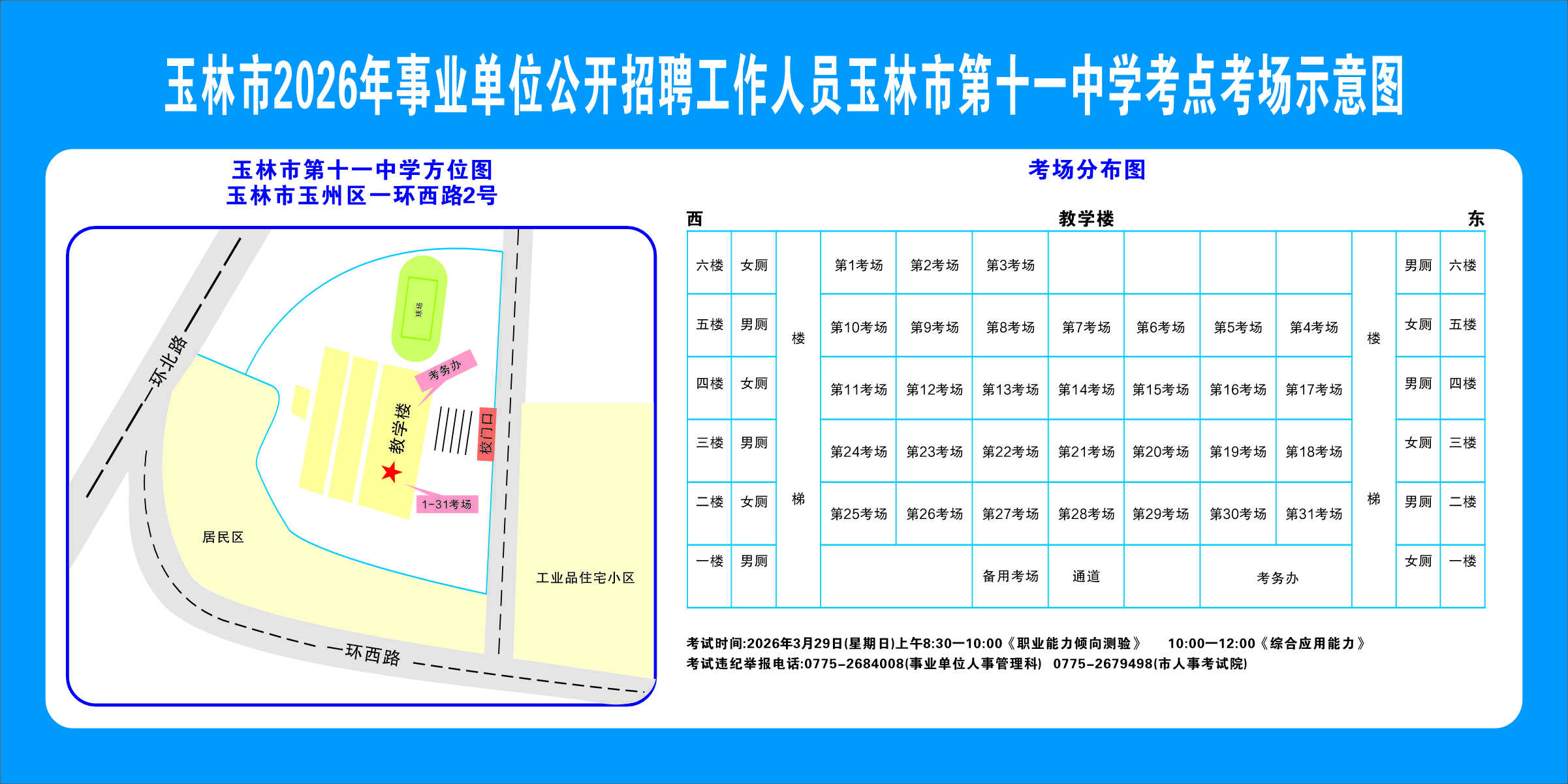 2.需要特別注意的是:玉林市第一職業(yè)中等專業(yè)學(xué)??键c(diǎn)是設(shè)在該校的東校區(qū)(人民東路東235號(hào));玉林市第一中學(xué)考點(diǎn)分為運(yùn)嶺路校區(qū)(二環(huán)北路1228號(hào))、大北路校區(qū)(大北路453號(hào))。