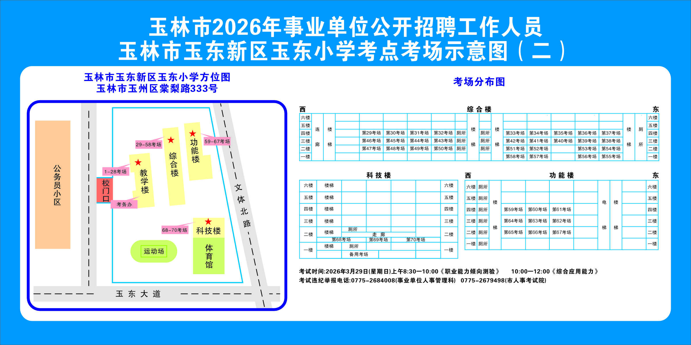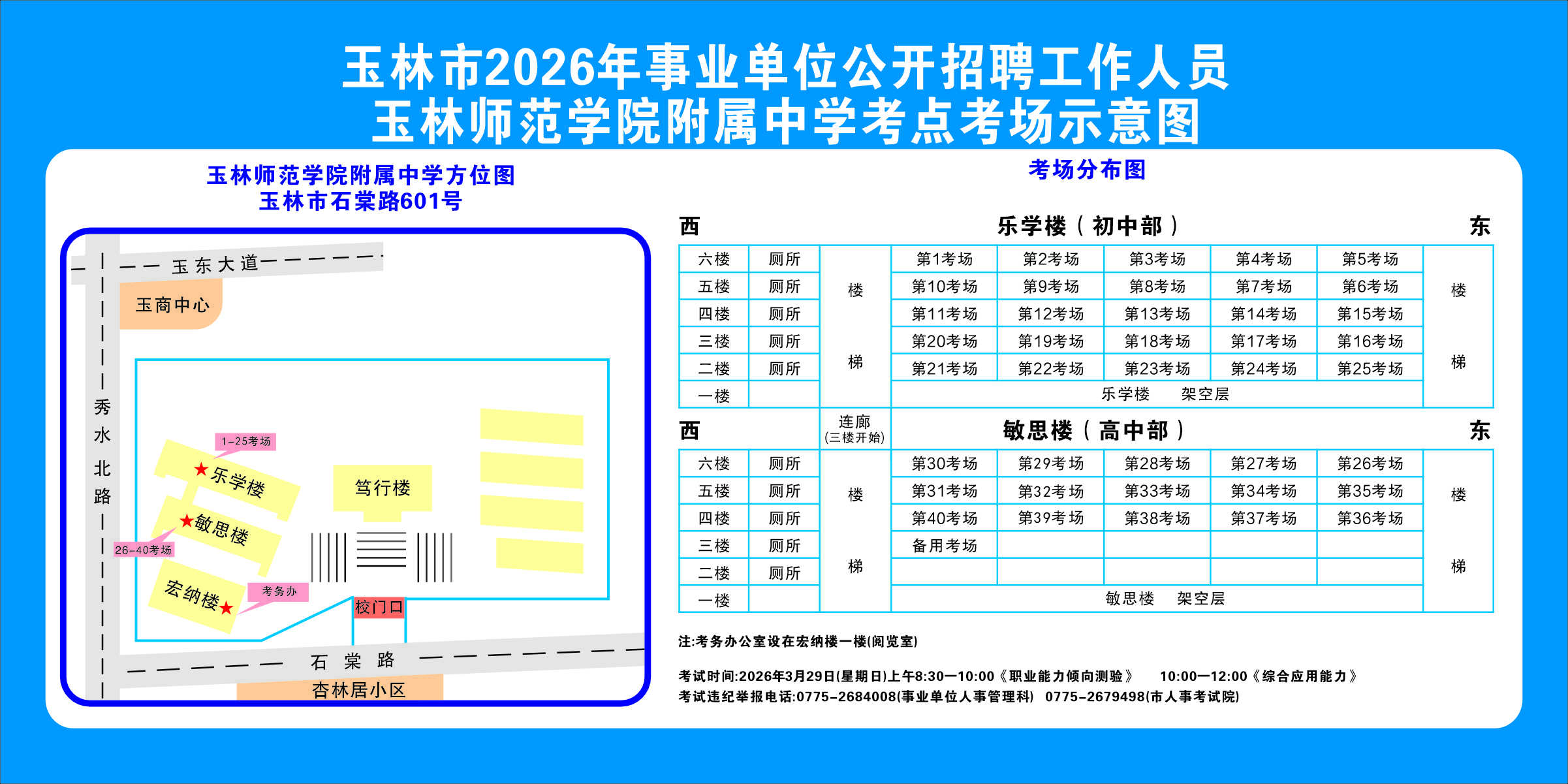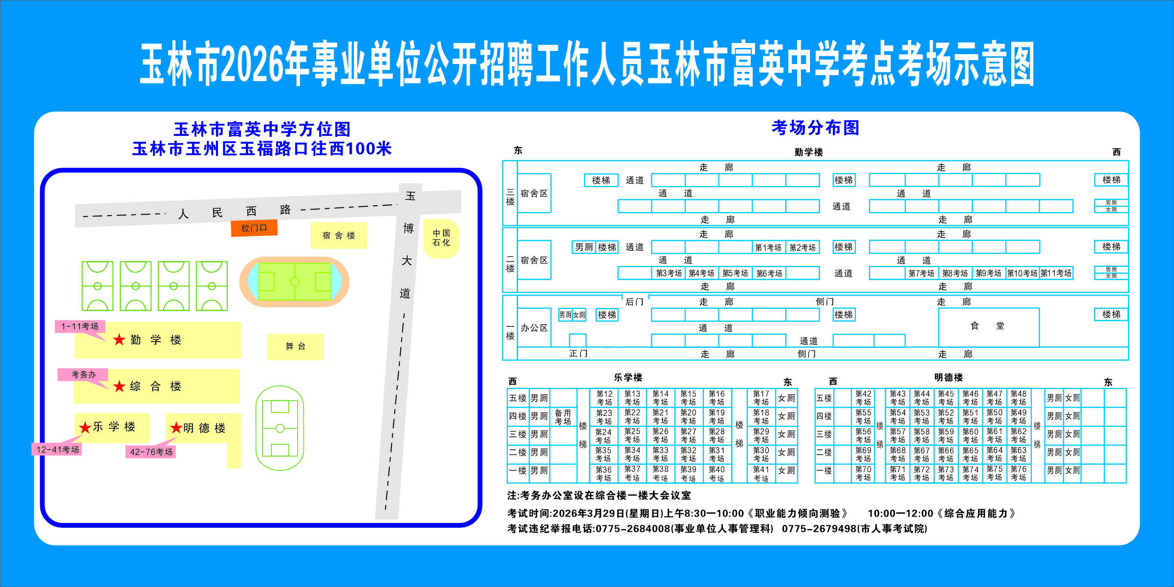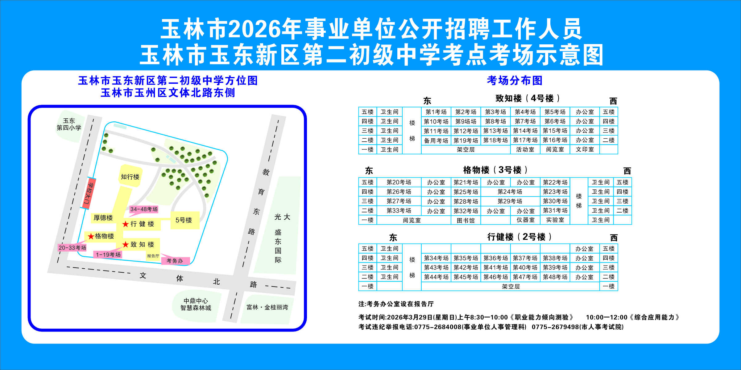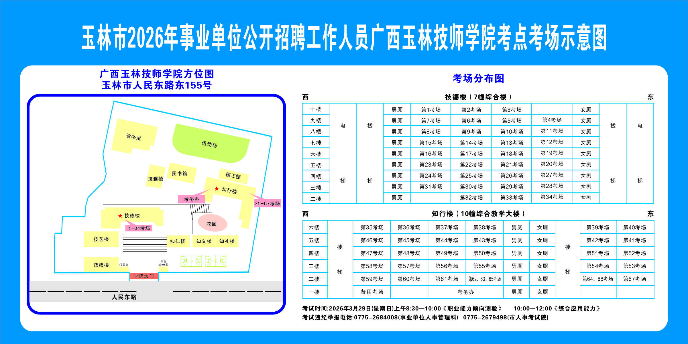 2.需要特別注意的是:玉林市第一職業(yè)中等專業(yè)學(xué)??键c(diǎn)是設(shè)在該校的東校區(qū)(人民東路東235號(hào));玉林市第一中學(xué)考點(diǎn)分為運(yùn)嶺路校區(qū)(二環(huán)北路1228號(hào))、大北路校區(qū)(大北路453號(hào))。