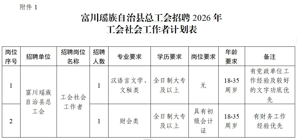 1.富川瑤族自治縣總工會招聘2026年工會社會工作者計劃表