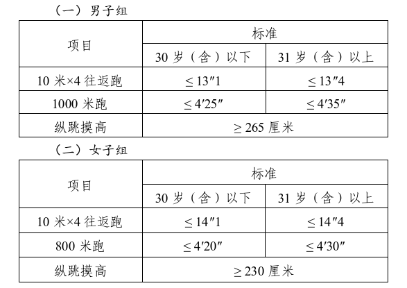 體能測評三項全部達標(biāo)方為合格。其中:縱跳摸高的測試次數(shù)不超過3次,10米×4往返跑的測試次數(shù)不超過2次,1000米跑/800米跑的測評次數(shù)為1次。